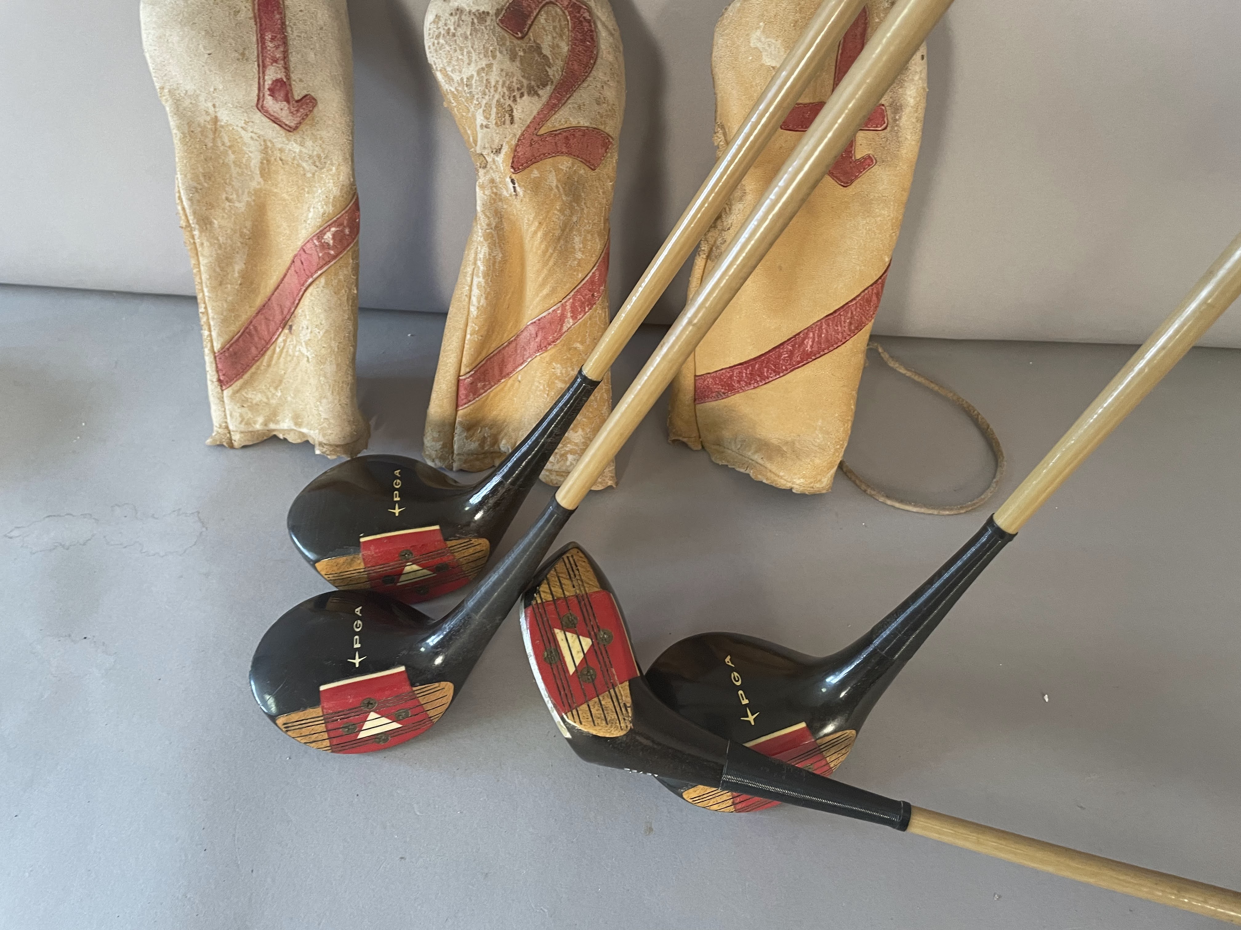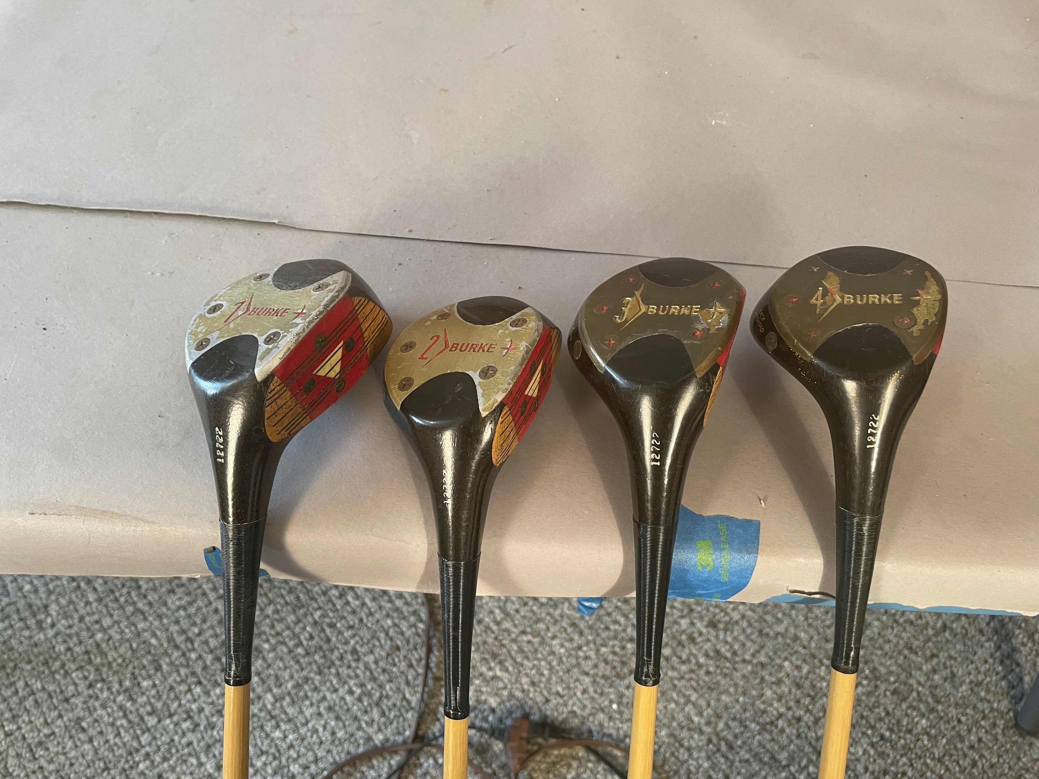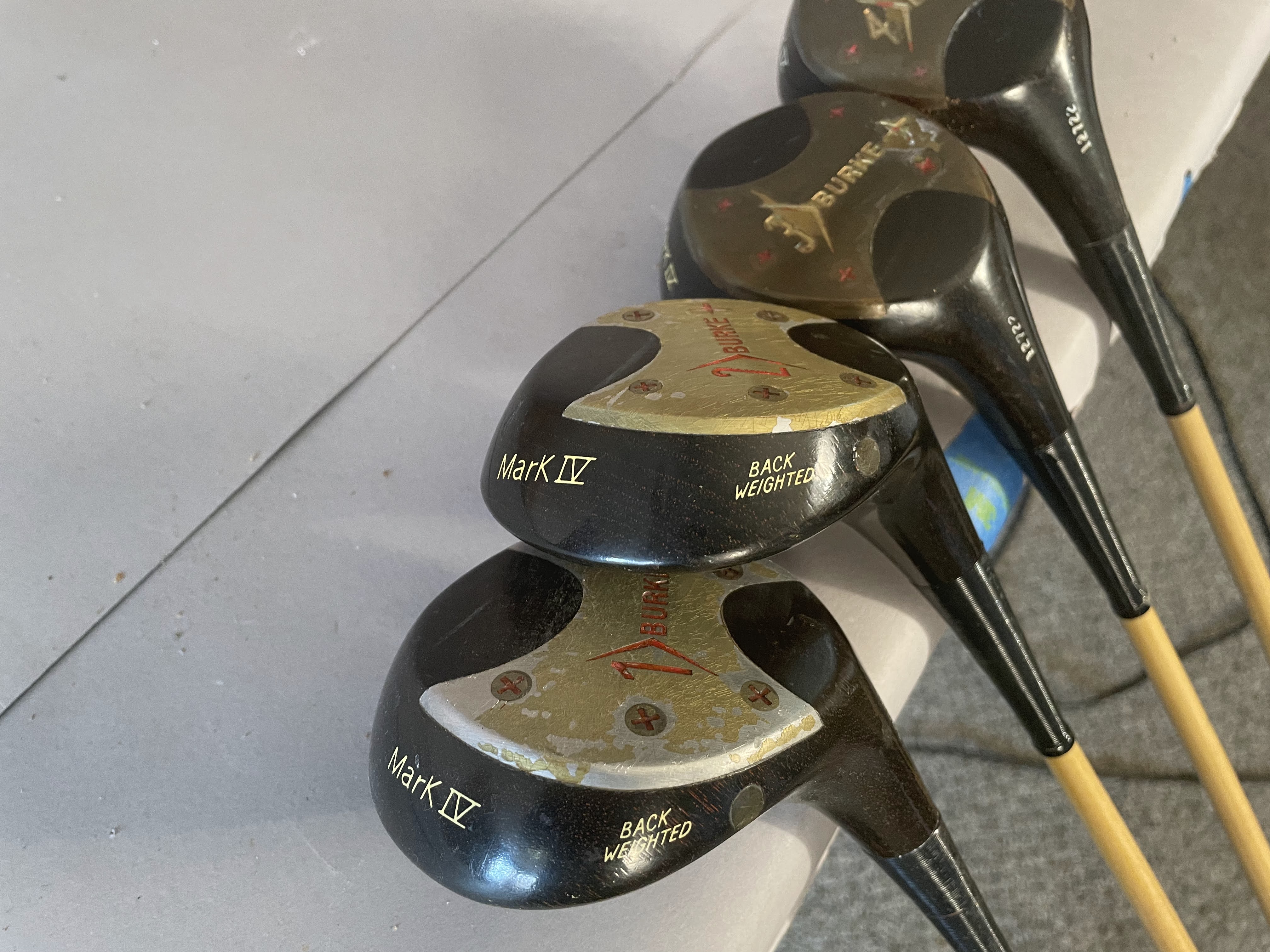 Woods: Set includes Driver,2,3 and 4 woods. The persimon woods have never been refinished and all have matching serial numbers (12722) The Burke PGA Mark IV woods have a red/white 4 screw insert and 3 matching headcovers. The shaft is coated pyratone sheath steel . All have original grips and are in showroom quality.