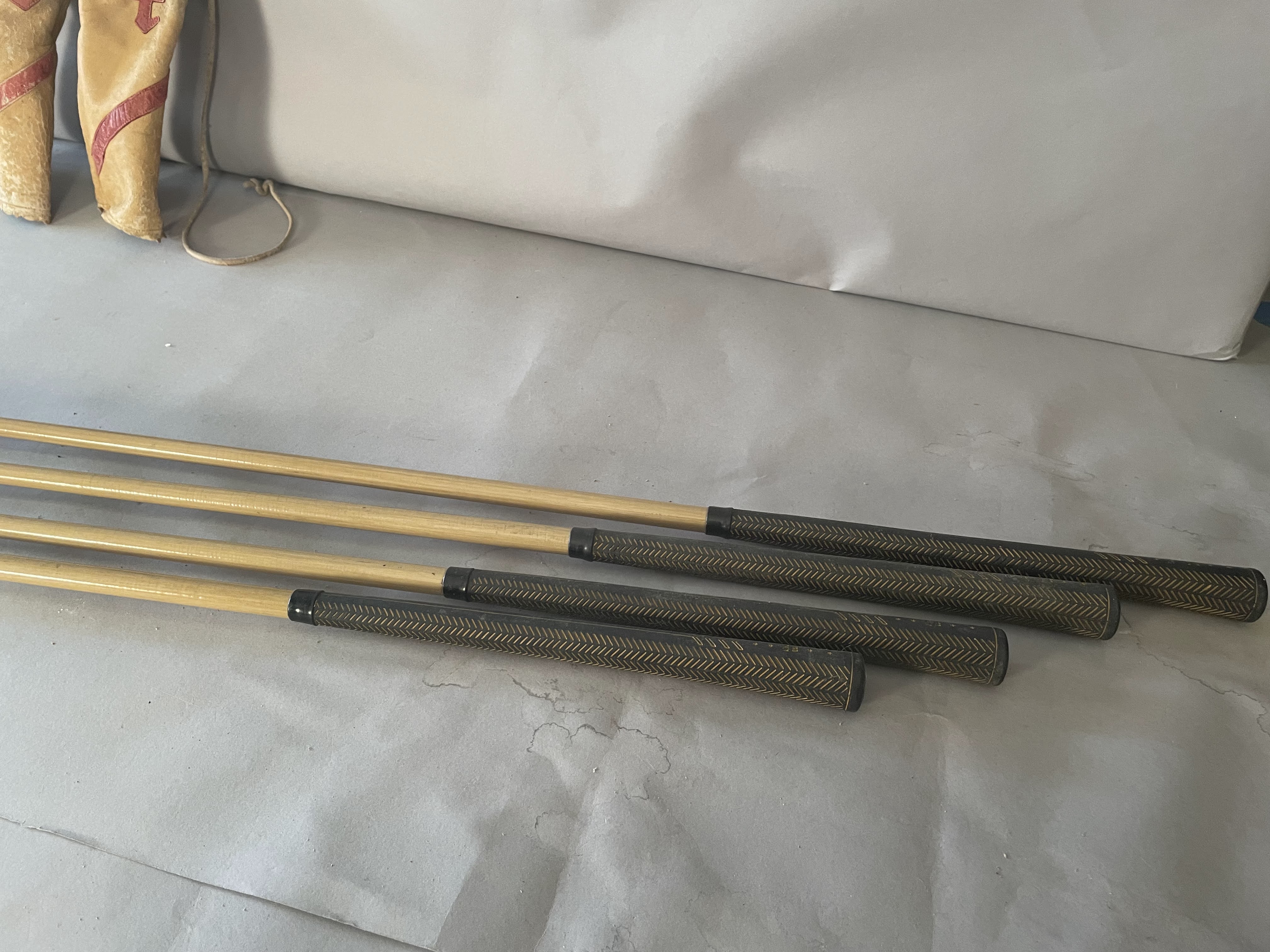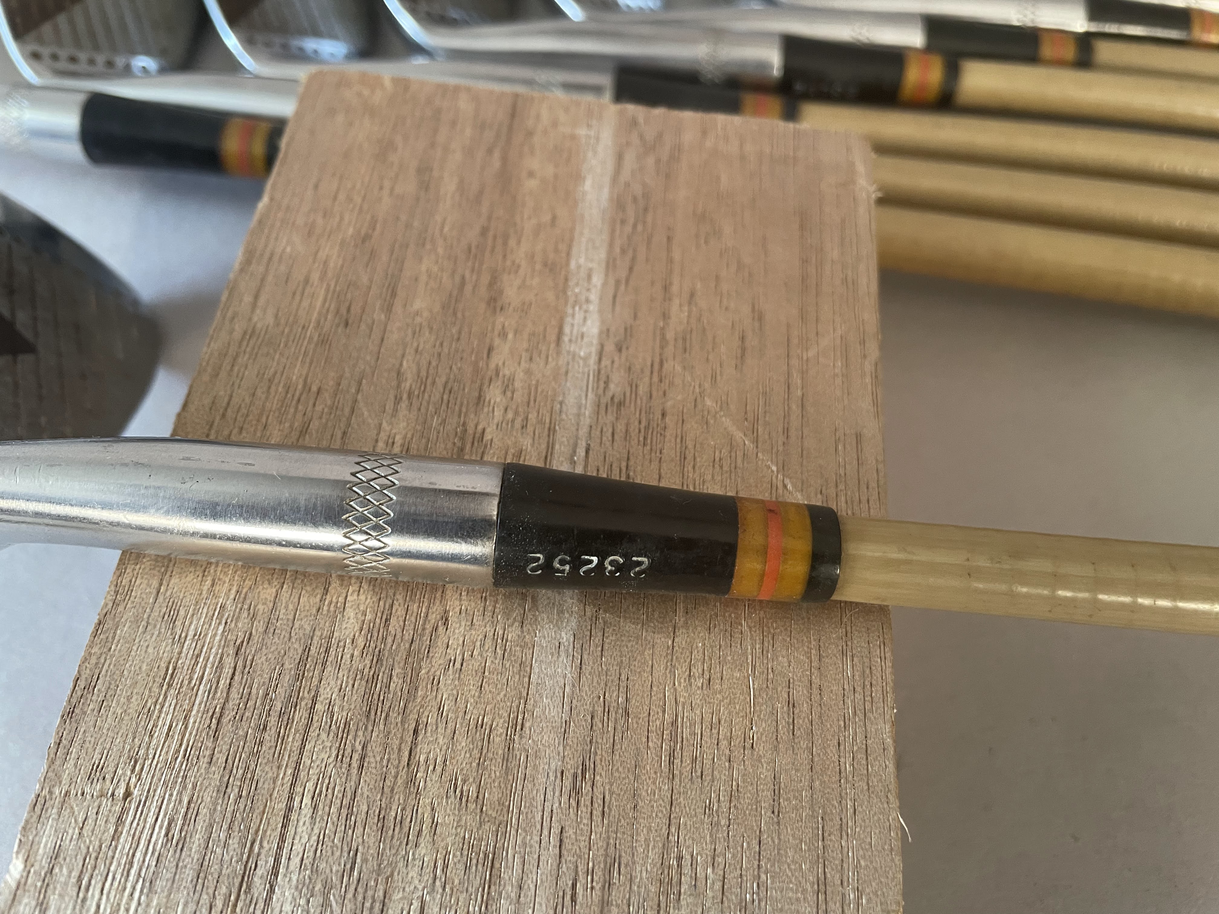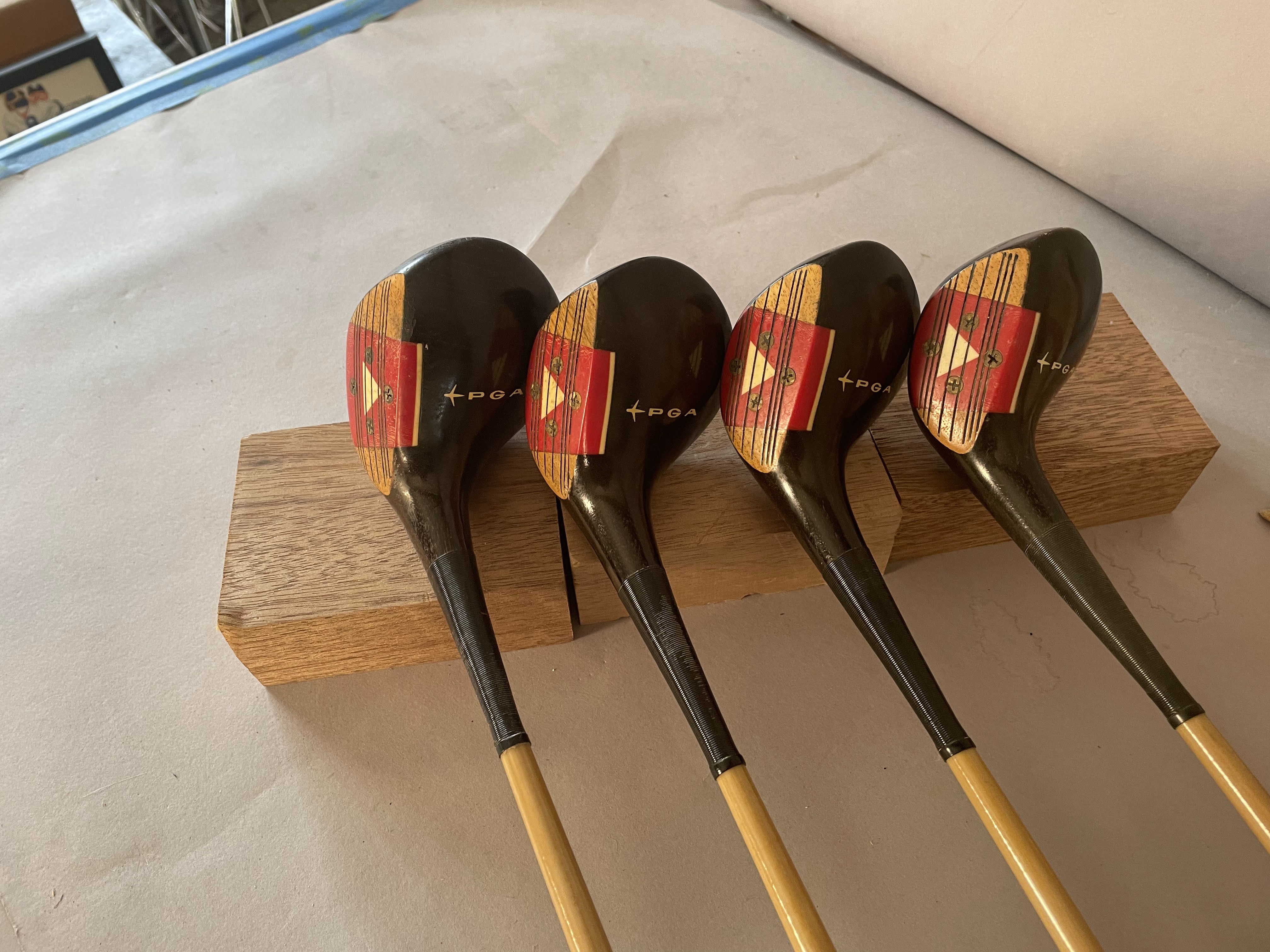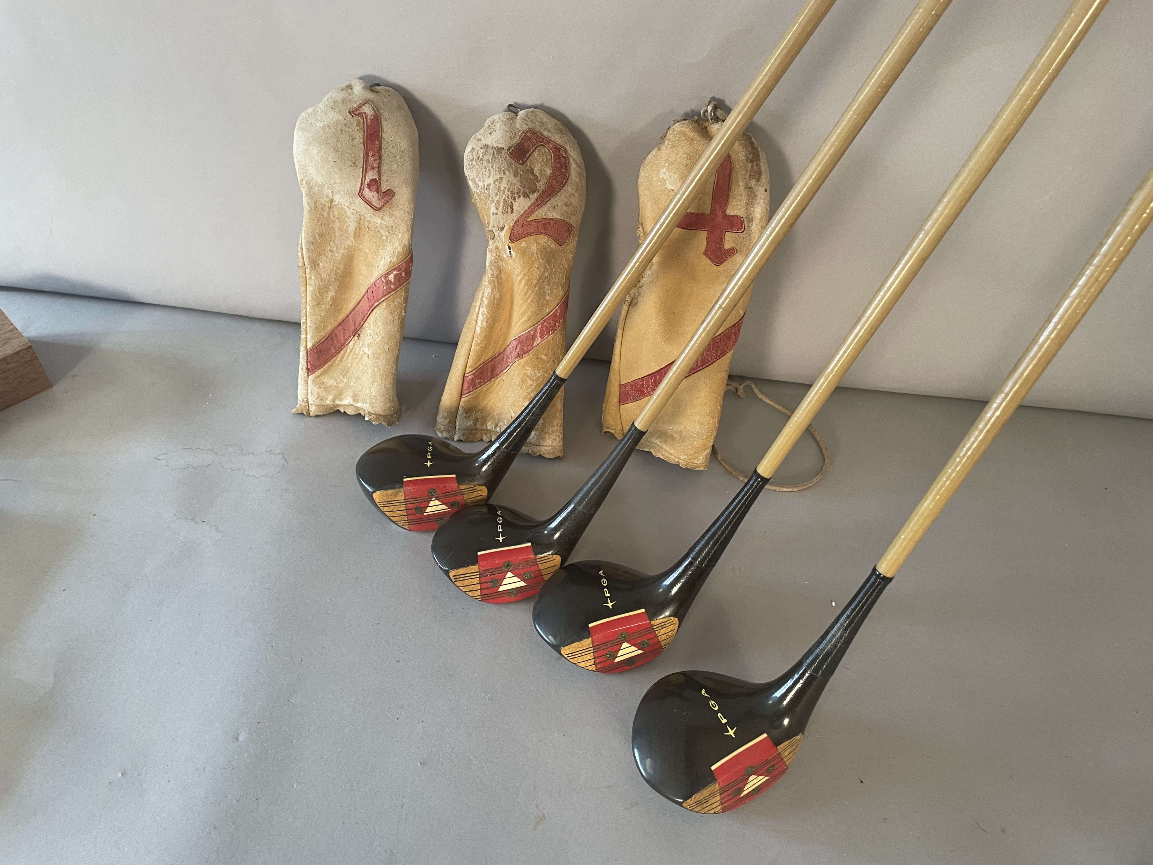 Woods: Set includes Driver,2,3 and 4 woods. The persimon woods have never been refinished and all have matching serial numbers (12722) The Burke PGA Mark IV woods have a red/white 4 screw insert and 3 matching headcovers. The shaft is coated pyratone sheath steel . All have original grips and are in showroom quality.
