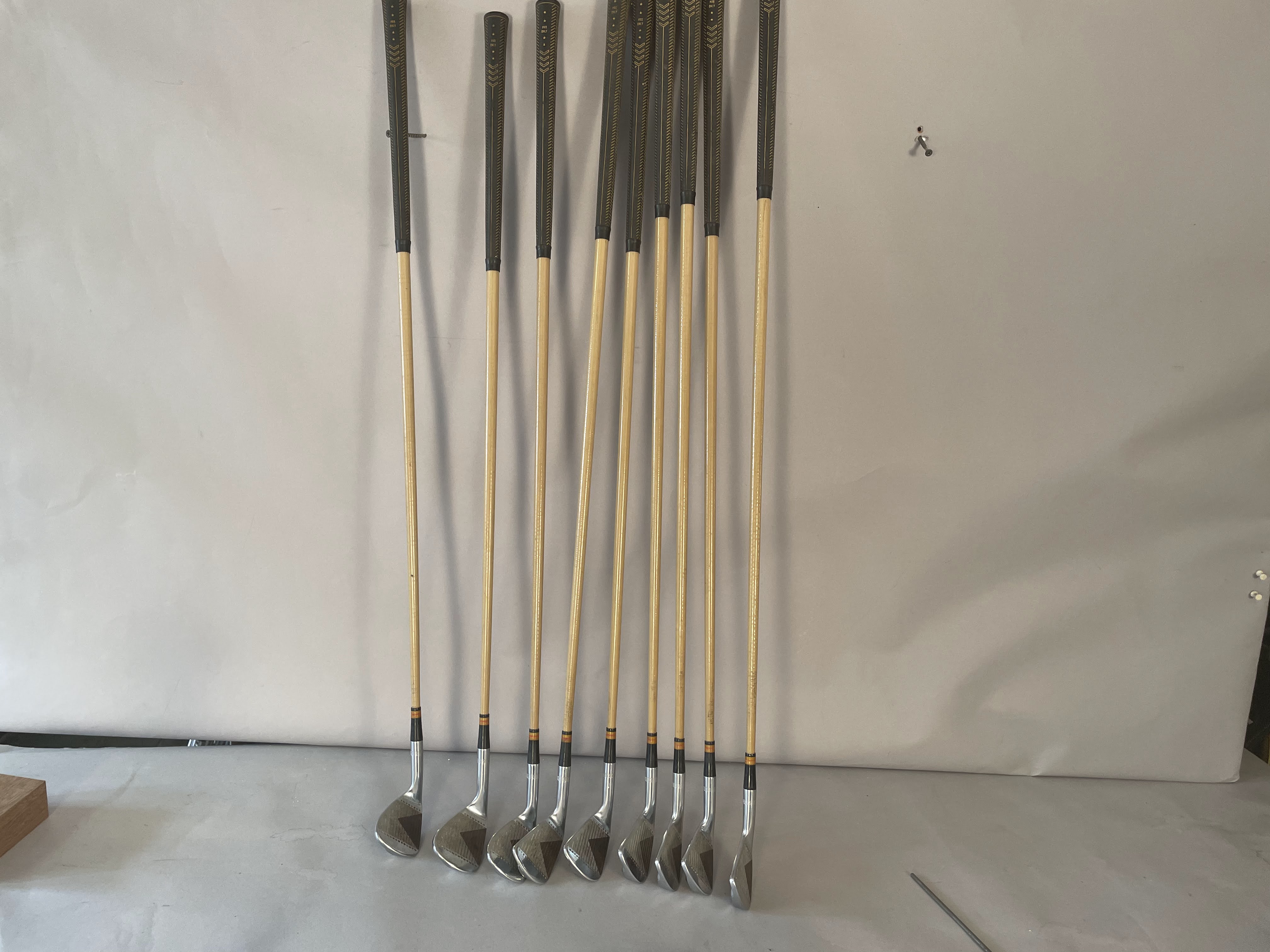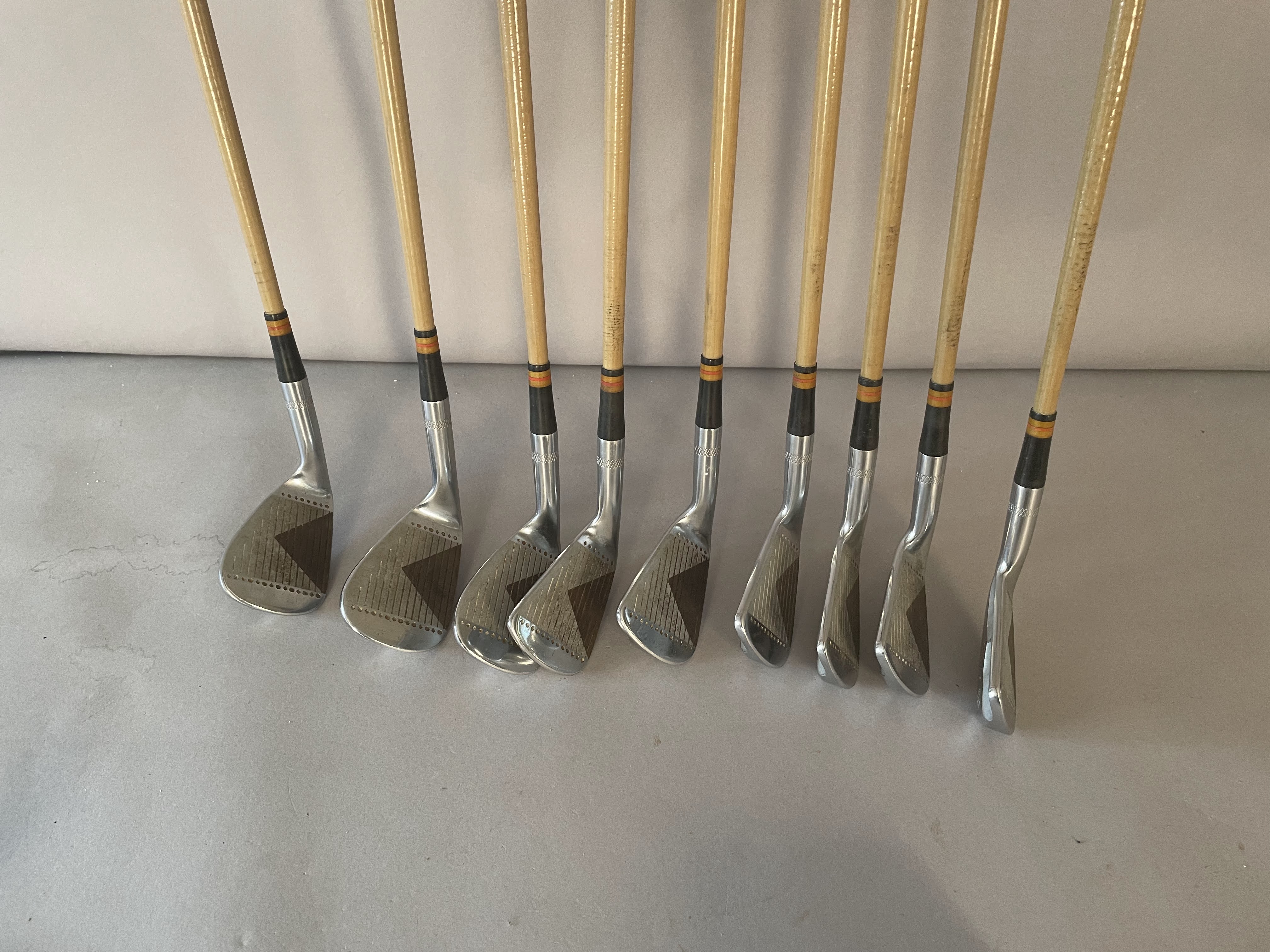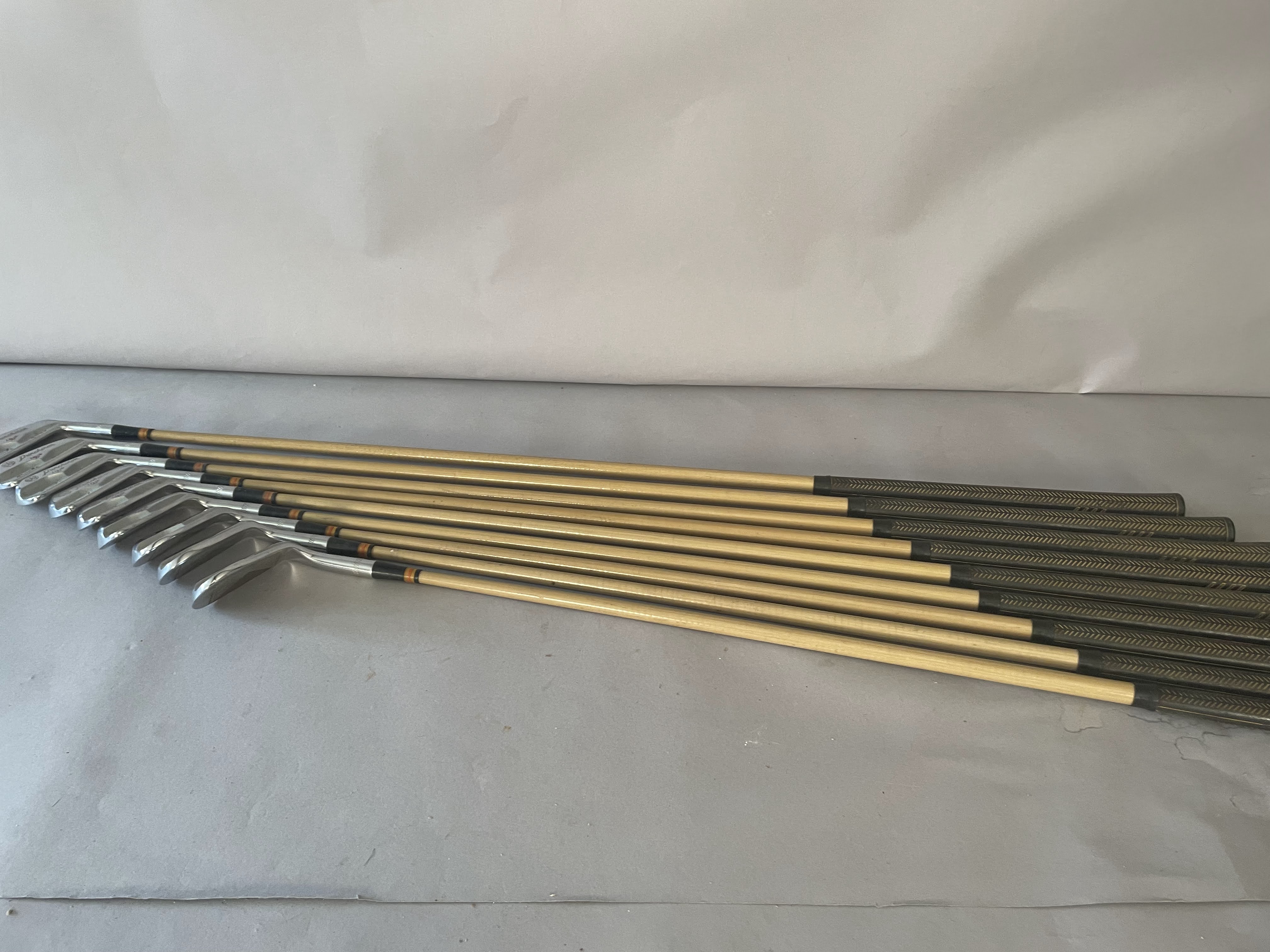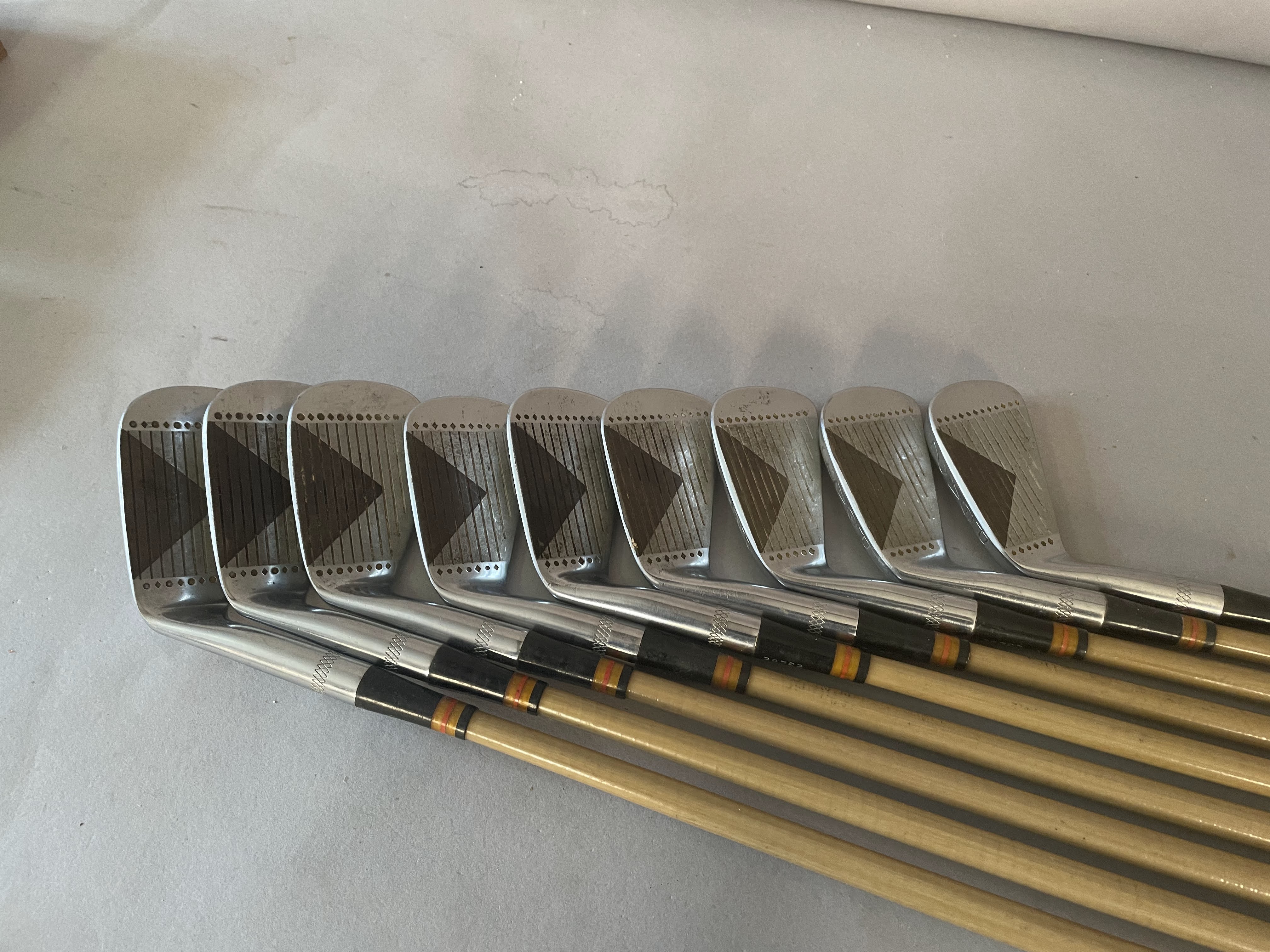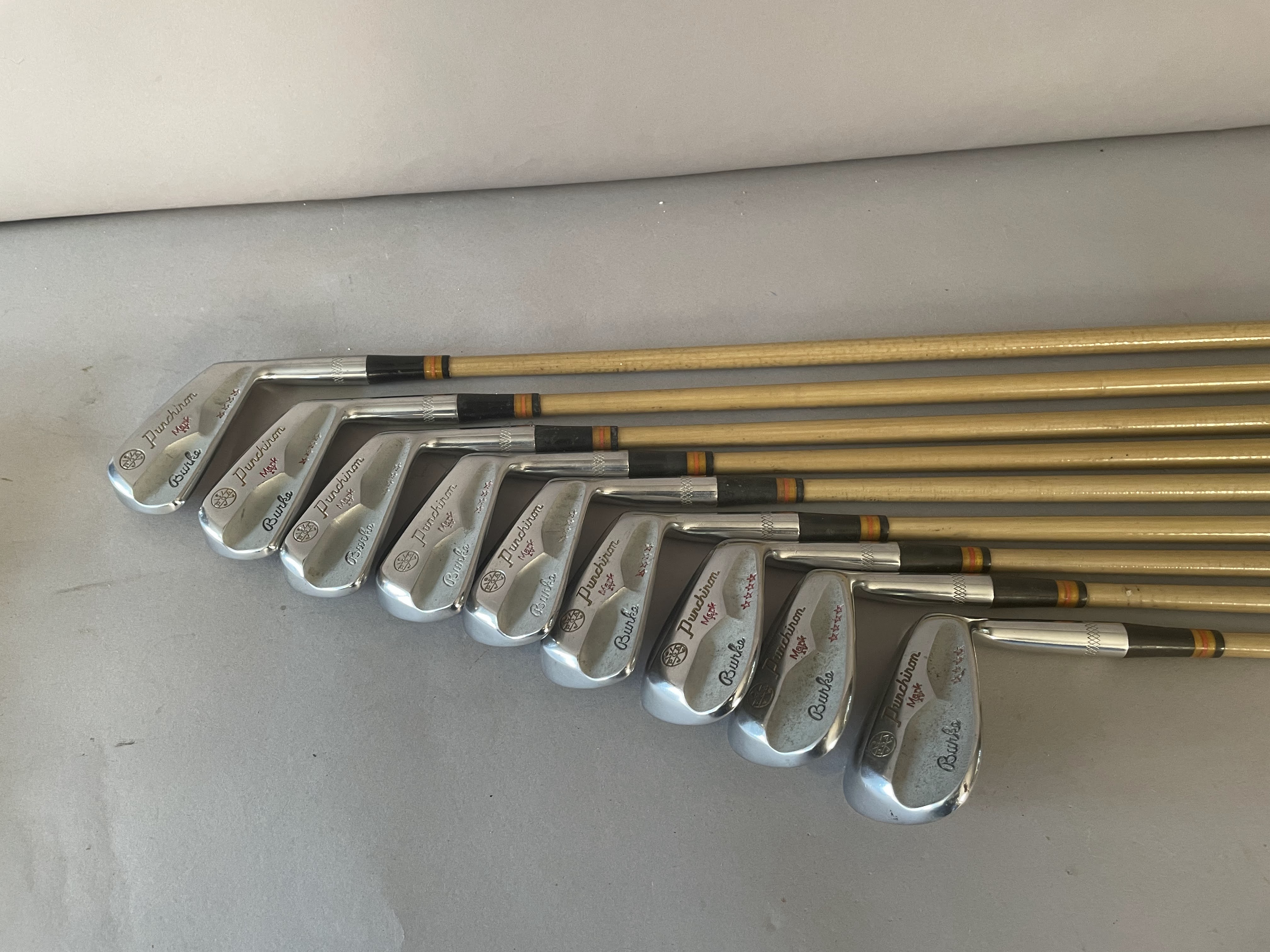 Irons: The set of Burke PGA Mark IV punchirons are 2-PW all with matching serial numbers (23252).The shafts are pyratone coated steel with very unique face as shown. All grips are original and clubs are in showroom quality.