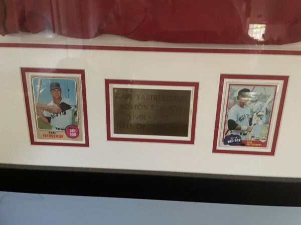 Showing a Carl Yastremski signed Cutter and Buck red windbreaker with Boston Red Sox logo. Yax signed my golf windbreaker at the Adios Golf Club in Coconut Creek Florida on February 23rd, 2010. The Hall of famer signed Carl Yastremski HOF 1989. COA attached with 3 witnessed the signing. Framed Jersey and framed windbreaker hang in my living room. not for sale/display only.