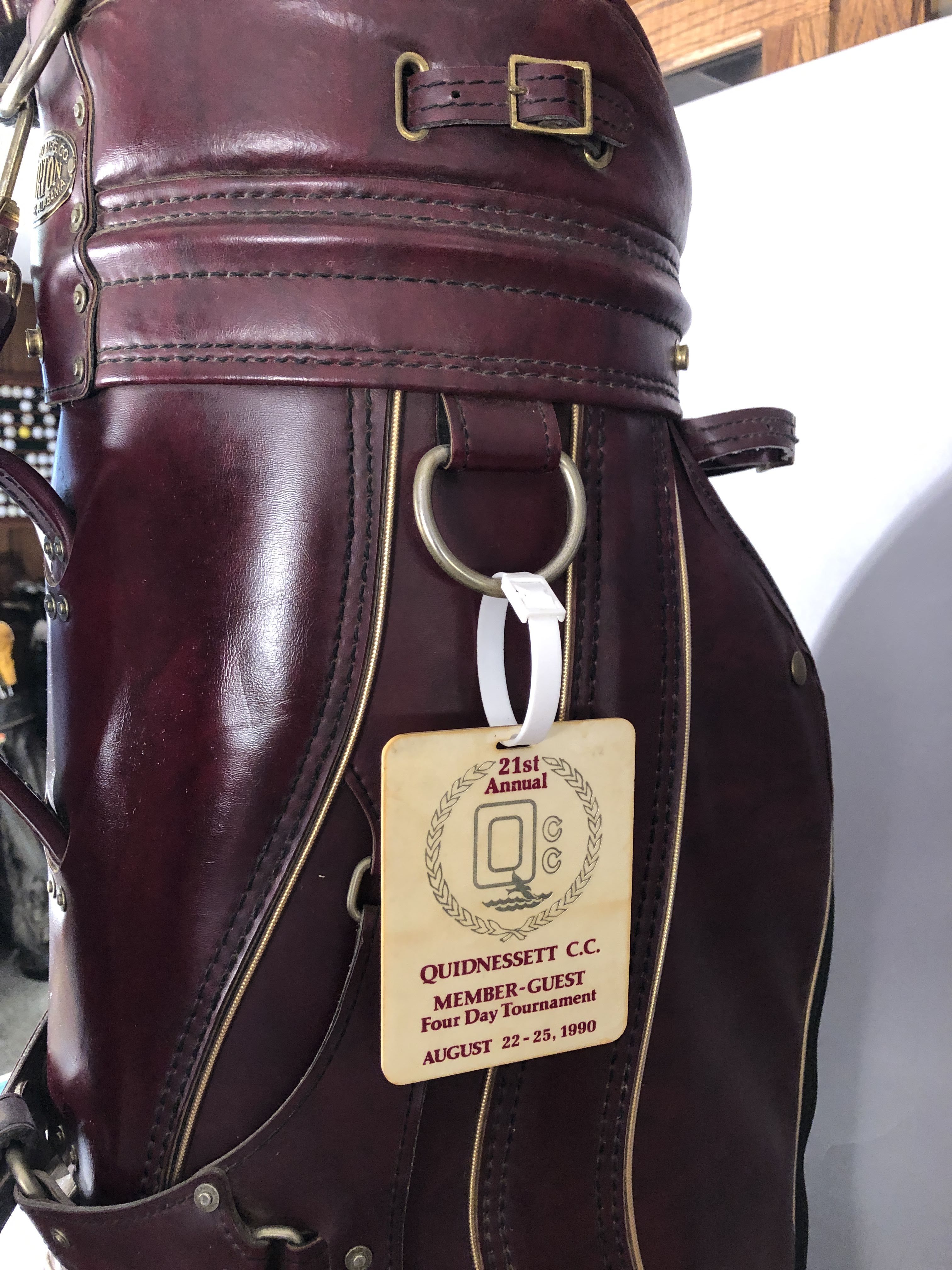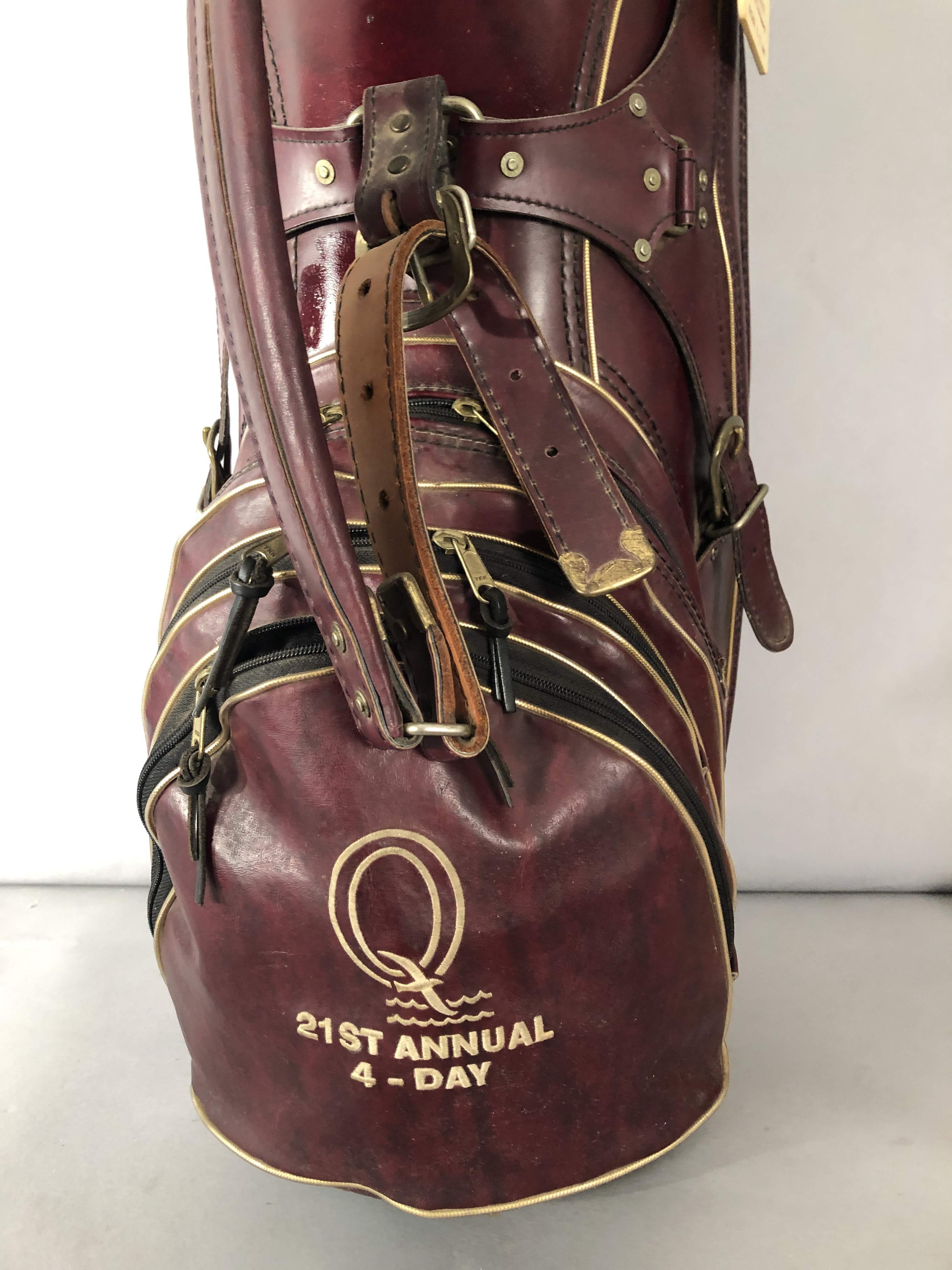 Displaying a beautiful Burton Cart Bad from the 21st Annual 4 Day Member Guest from August 22nd-25th 1990. This burgundy bag was awarded to divisional winners of the tournament. Bag tag with Head Pro Tom Greene attached.