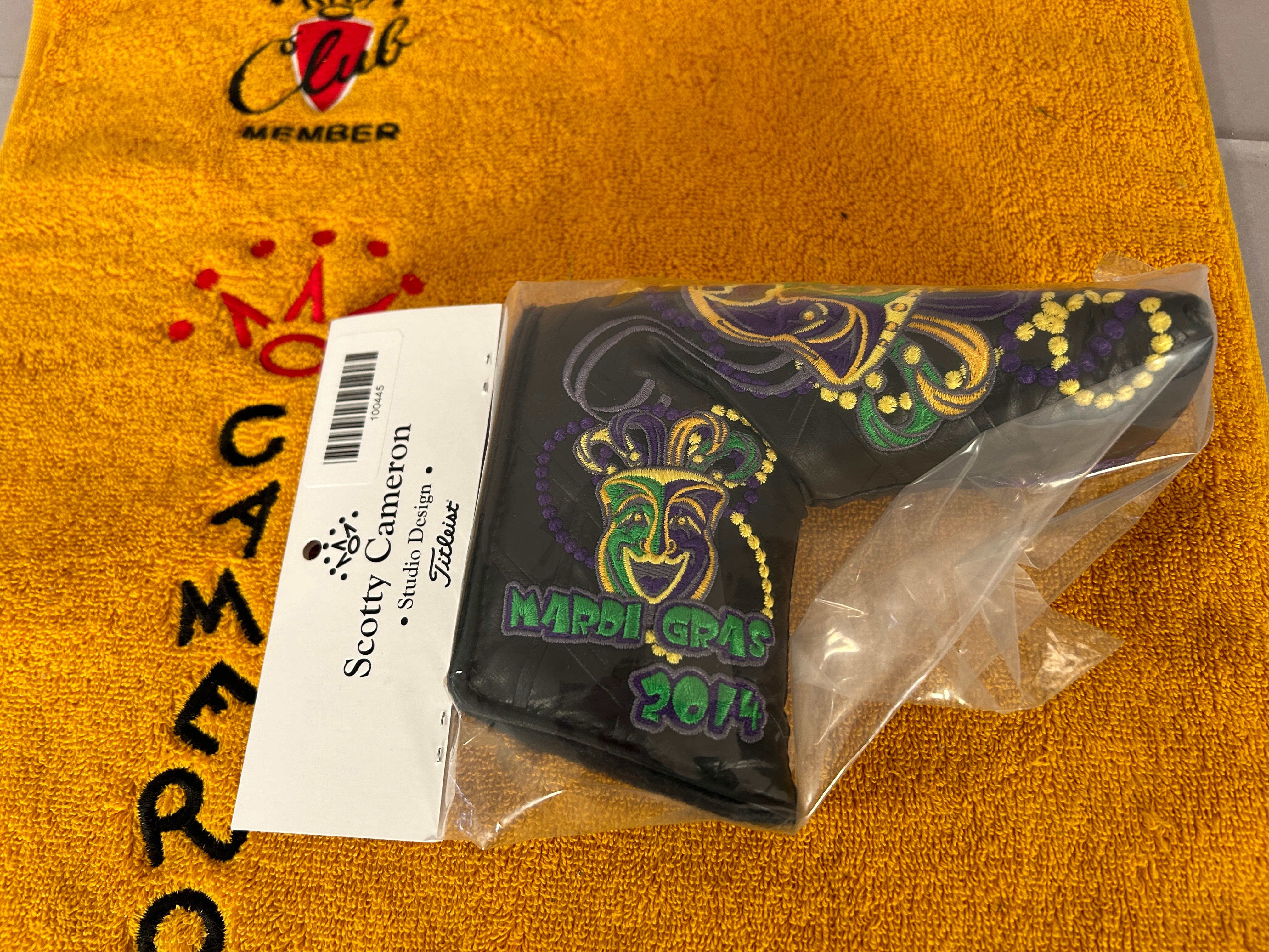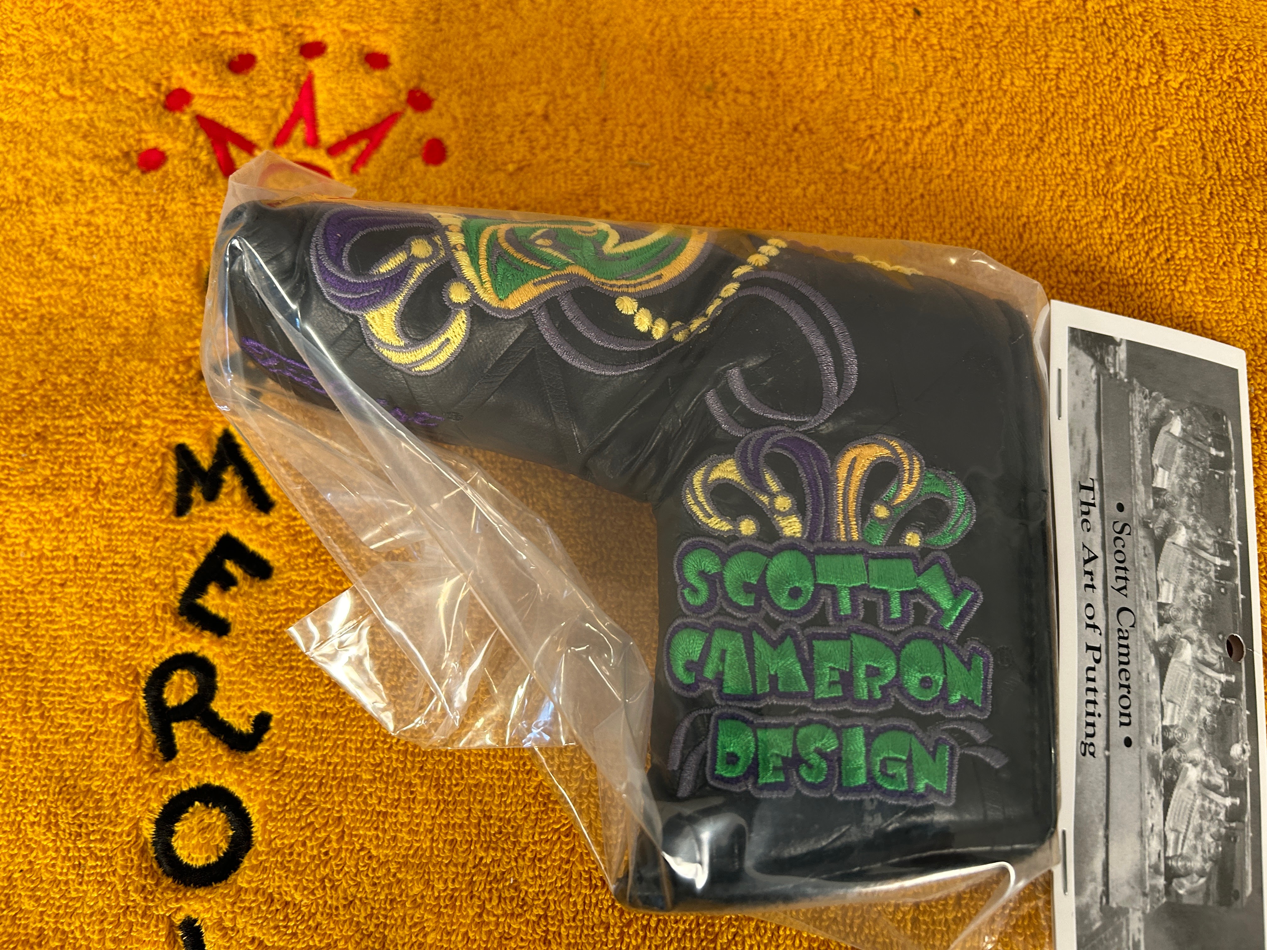 Scotty Cameron 2014 Mardi Gras Putter Headcover (NEW). Adorned the official Mardi Gras colors of Purple, Gold and Green gives this cover a great reason for revelry and fun during Carnival. Cover released to club members on February 25, 2014. Price is $149.99 with $15.00 shipping USPS Ground continental US. SC Cover Cat #078