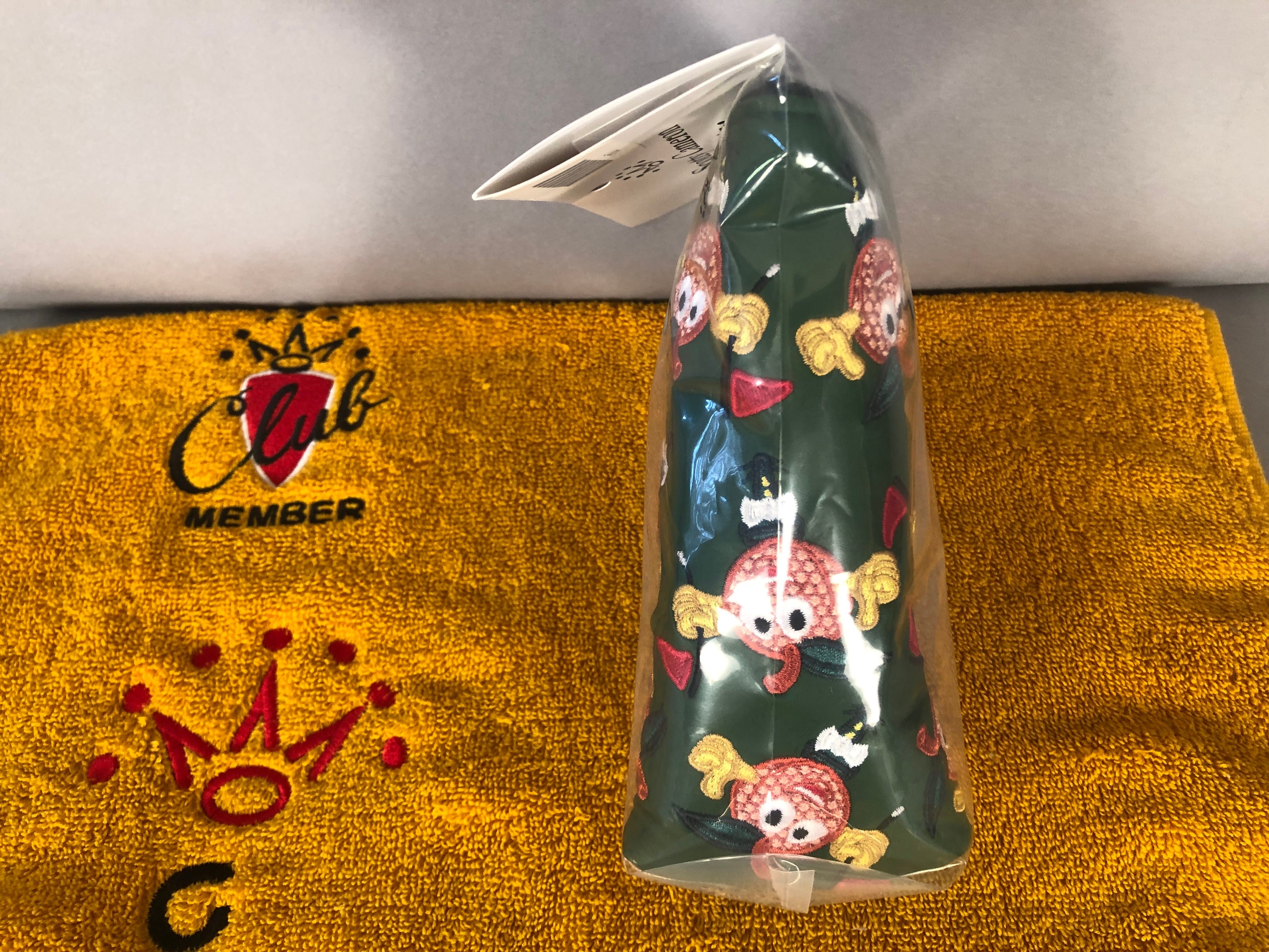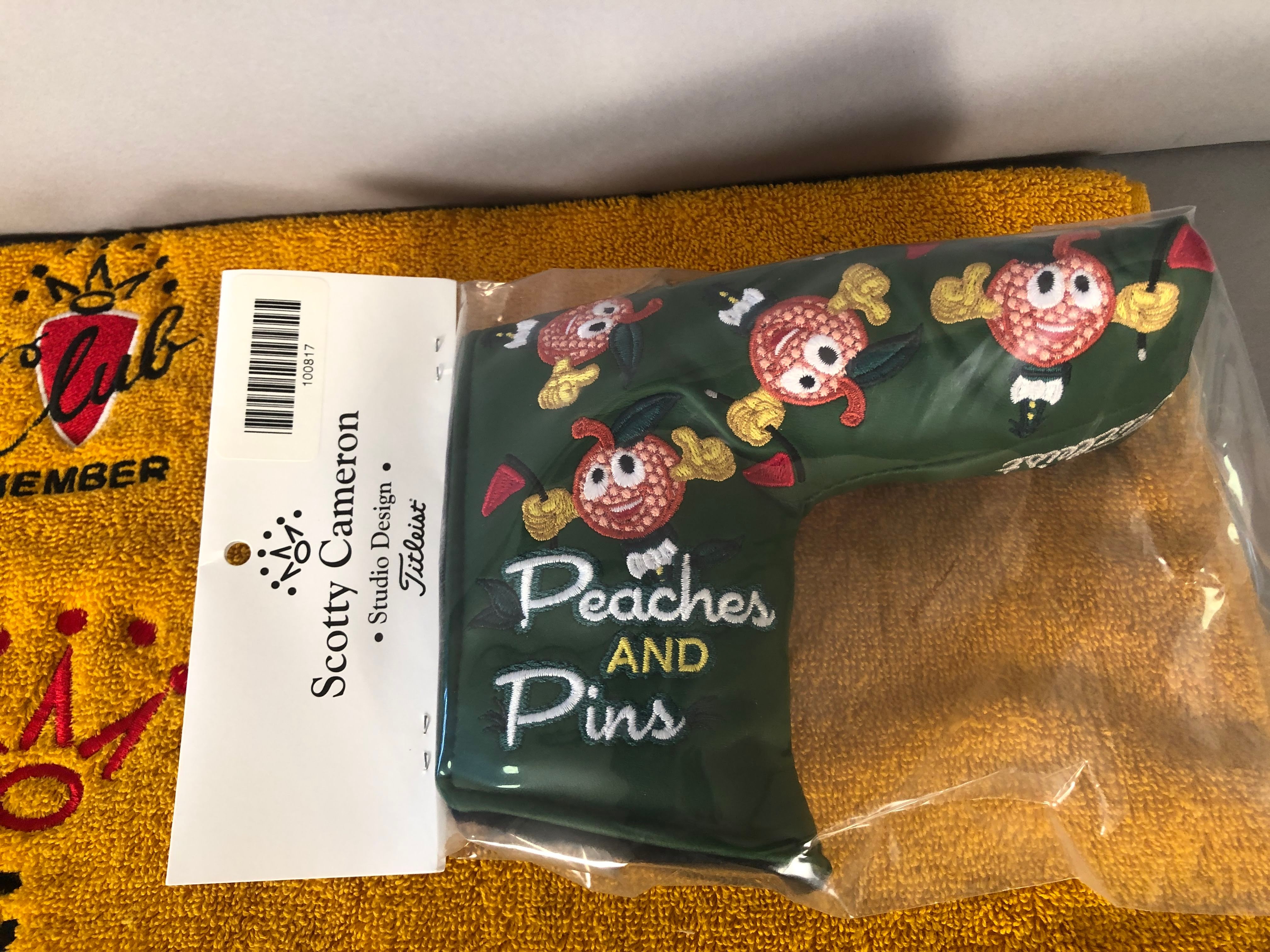 Cat# SC Headcover #030. Offering a Scotty Cameron 2015 Peaches and Pins Putter Headcover . Cover released on April 7th, 2015 to club members to welcome in the Masters golf tournament from Augusta. Price is 125.00 and 14.00 shipping in the continental US.