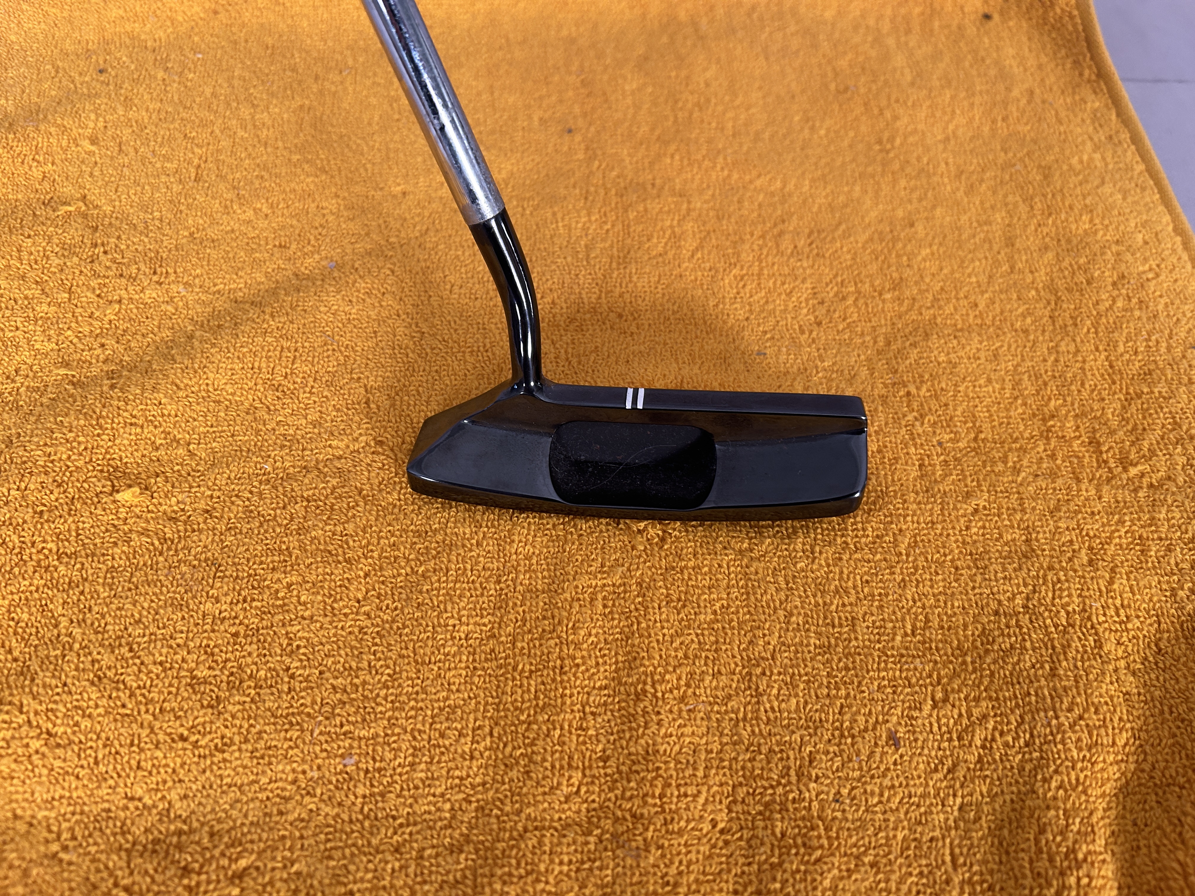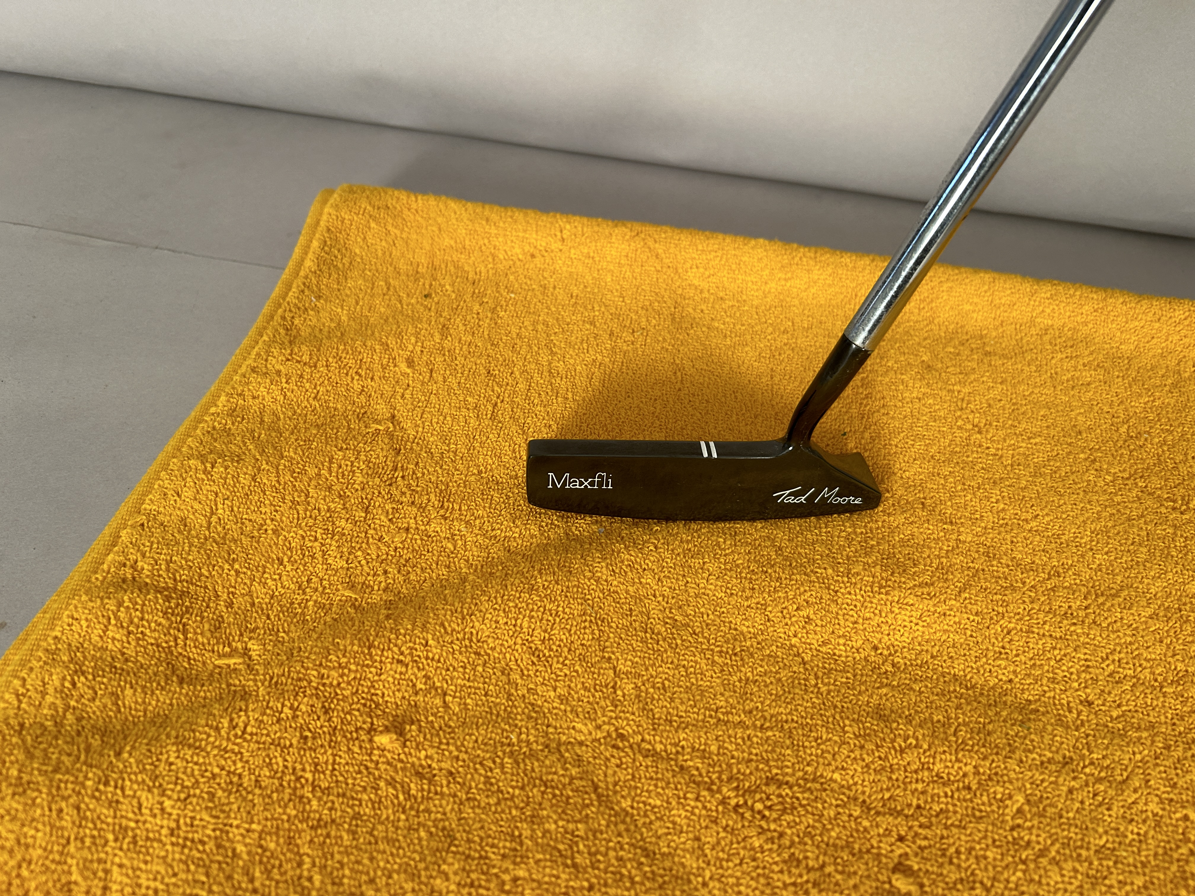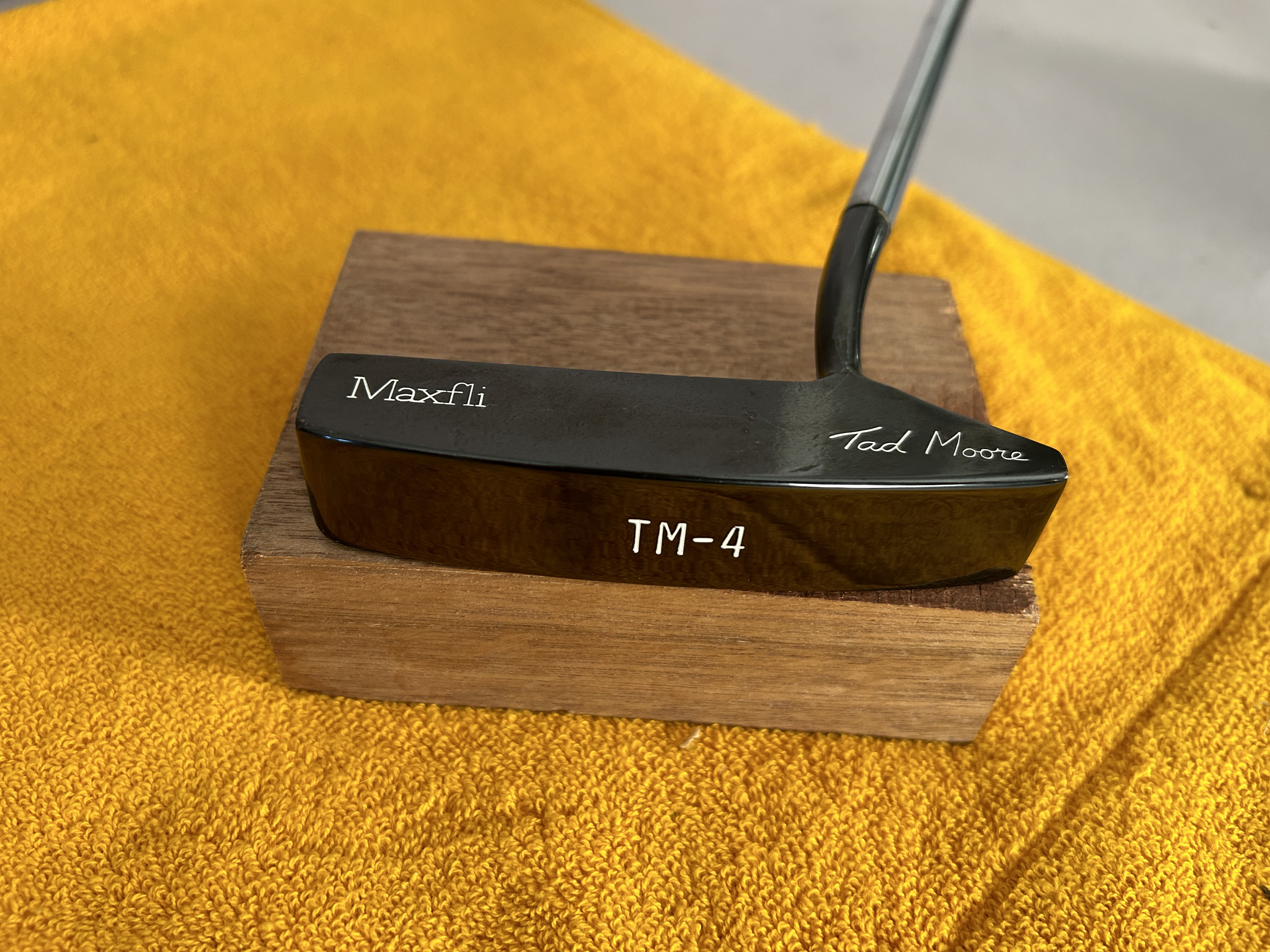 A Tad Moore Maxfli TM-4 Putter with original grip by Maxfli and original shaft with band in good condition. Putter is 35″ in length with double white sight lines on top of club. Putter has been restored by BOS golf of San Marcos California in a Black Oxide finish. with white lettering. Non-matching Headcover provided to protect club. Price is 160.00 with 25.00 shipping continental US.